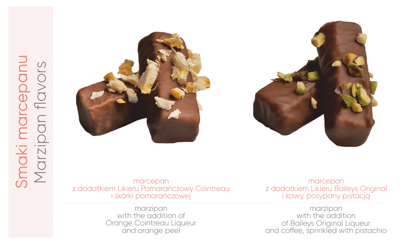 Marcepan z dodatkiem alkoholu to słodki rarytas dla podniebienia. Polecamy efektowną bombonierkę, w której znajdziesz 6 sztuk tych wyjątkowych słodkości w 2 zaskakujących wariantach smakowych: z dodatkiem likieru Baileys Original i aromatycznej kawy, posypany pistacją oraz z dodatkiem Likieru Pomarańczowego Cointreau i skórki pomarańczowej.