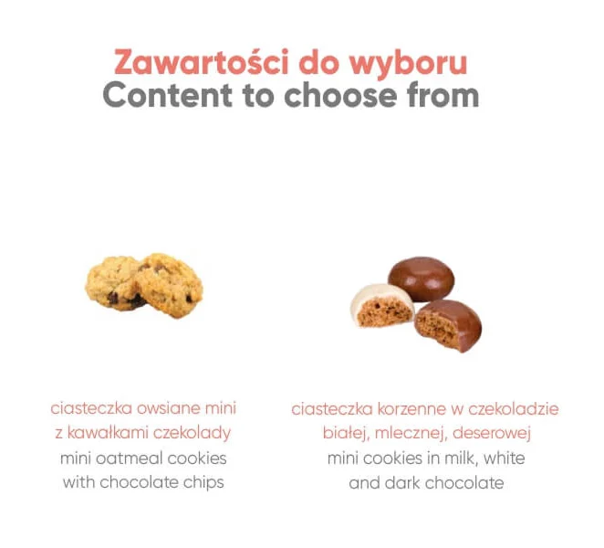 | Zawartość | ciasteczka owsiane i ciasteczka korzenne w białej, mlecznej i deserowej czekoladzie (łącznie 150 g) |