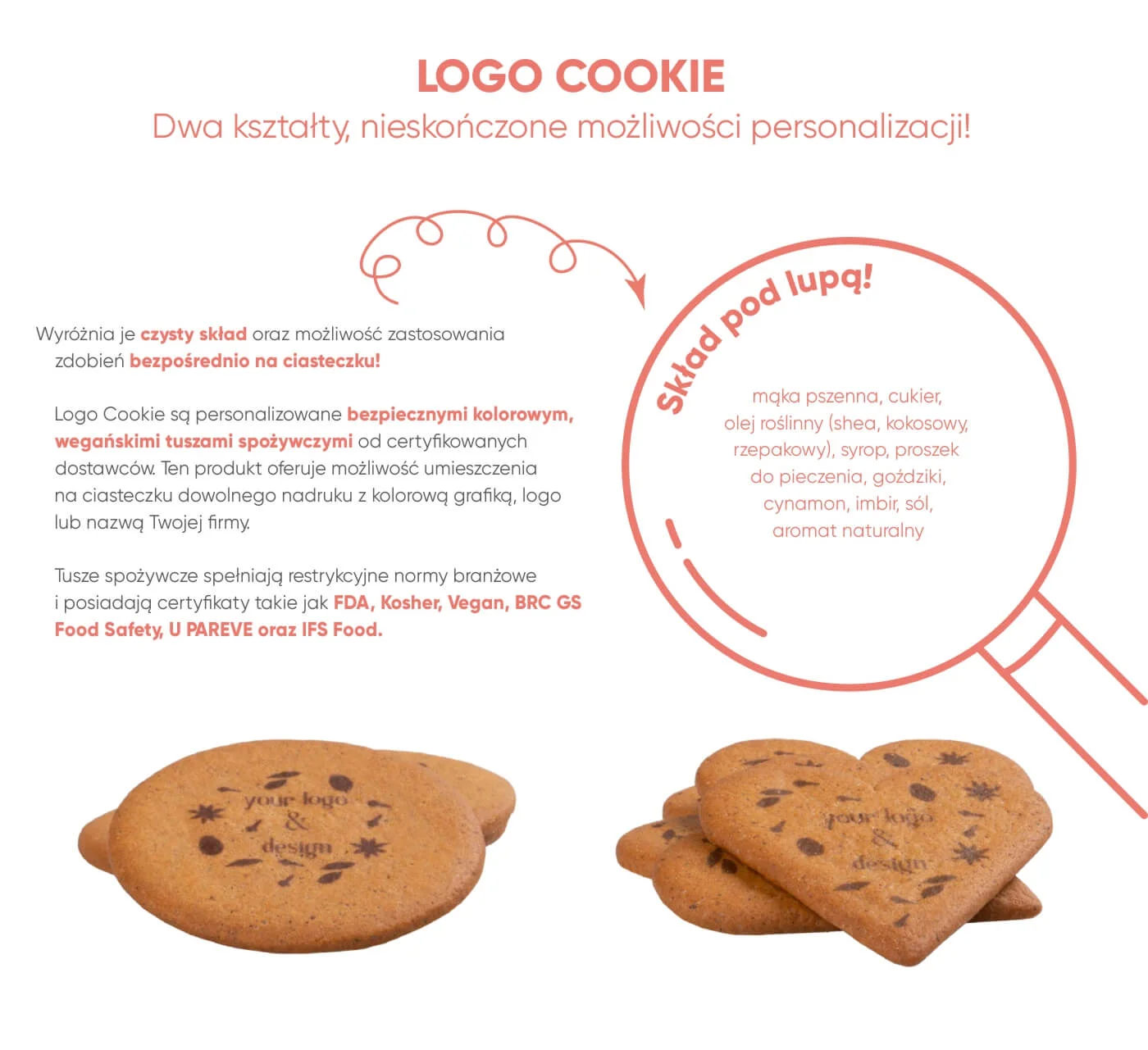 Prosty skład bez sztucznych aromatów, barwników czy konserwantów, za to z naturalnym cynamonem, imbirem i goździkami – takie są Logo Cookie! Każde z nich personalizujemy nadrukiem bezpośrednio na ciastku i pakujemy w folię kompostowalną, by móc jak najdłużej cieszyć się ich chrupkością!