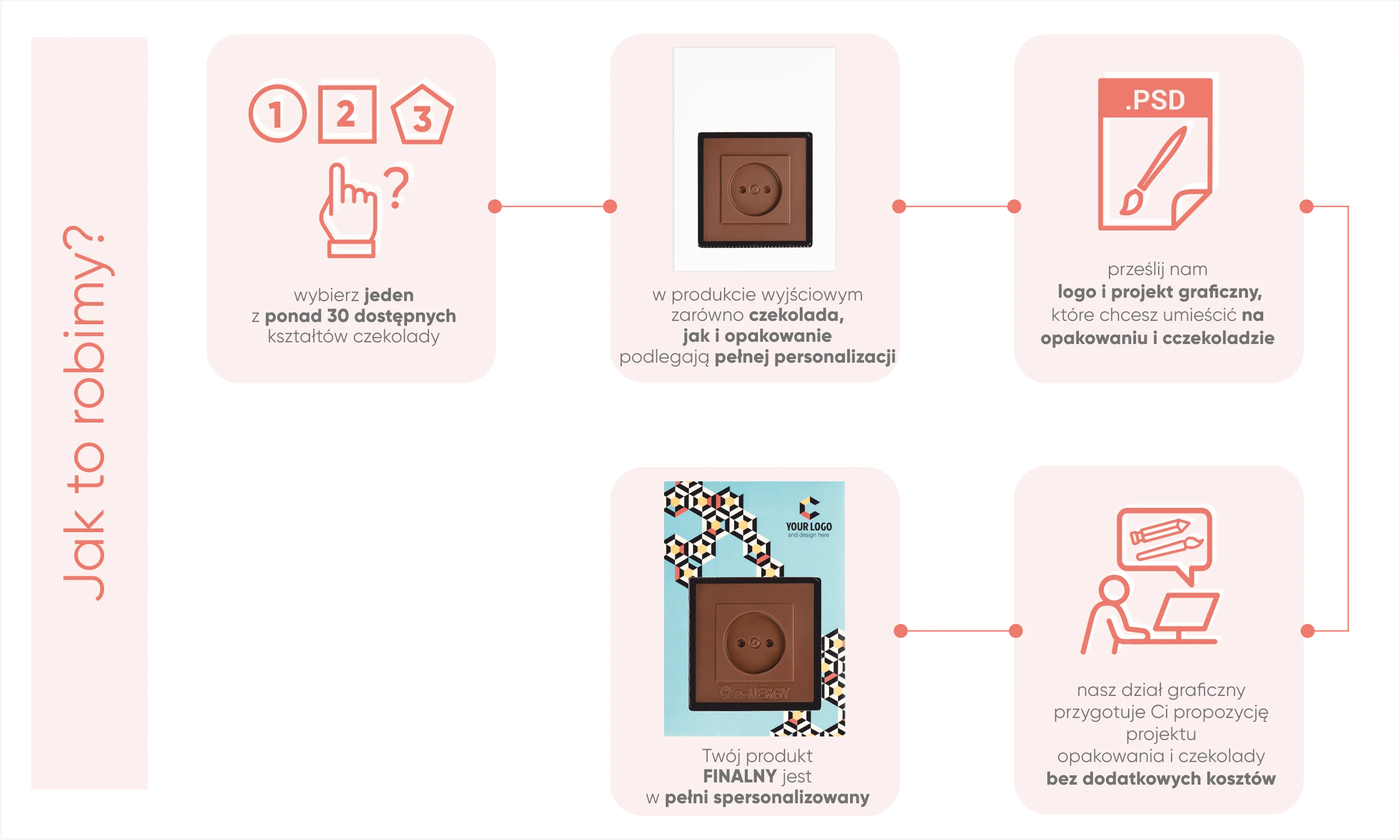 Kreatywne, świeże, wyjątkowe – oto Linia Choco4Mat, czyli tabliczki czekolady w wielu zaskakujących kształtach. Posiadamy ponad 32 gotowe formaty do wyboru, które tylko czekają aby spersonalizować je Twoim logo lub grafiką, lecz na Twoje życzenie stworzymy kolejne – zupełnie nowe i niekonwencjonalne kształty.
