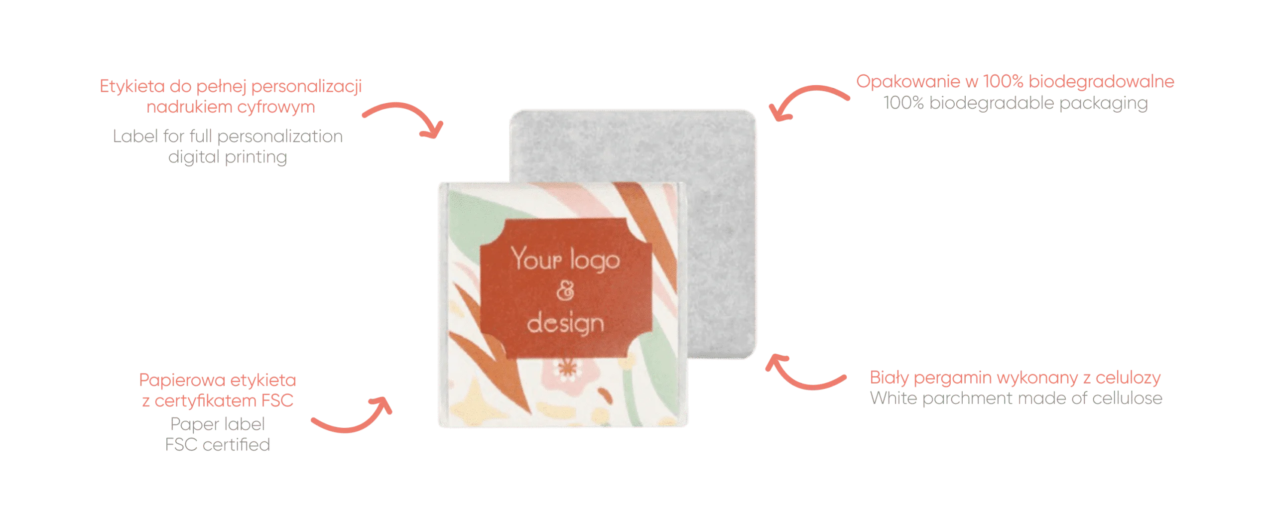 | Opcje | biały papier w standardzie, papier kraft i papier ecru z dodatkiem włókien trawy opcjonalnie do wyboru, kolor etykiety: biały, kolor folii czekoladek: srebrna, złota, czerwona, granatowa, czarna lub biały pergamin w 100% kompostowalny |