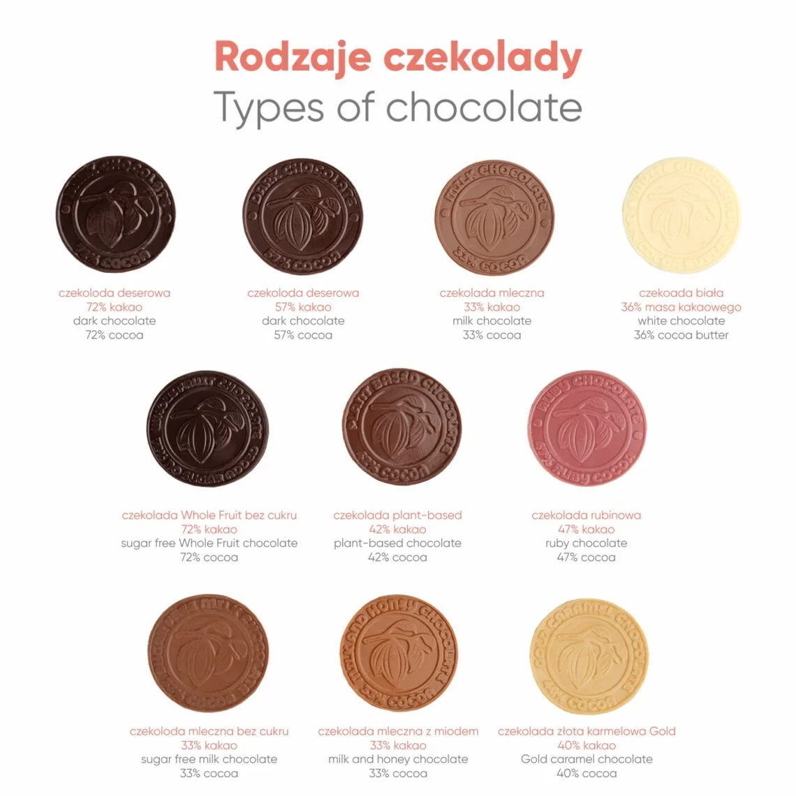 | Smak | czekolada mleczna (33% kakao), czekolada biała (27% masła kakaowego), czekolada deserowa (57% kakao), czekolada deserowa (72% kakao), czekolada rubinowa (47% kakao), czekolada mleczna z miodem (33% kakao), czekolada mleczna bez cukru (33% kakao), czekolada plant-based (53% kakao), czekolada Whole Fruit (72% kakao) bez dodatku cukru |